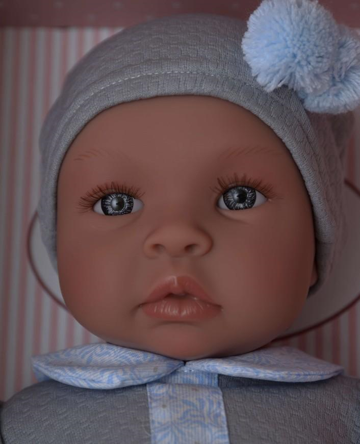 Precioso bebé Leo, realista, con un conjunto azul grisáceo, fabricado en España. Mide 46 cm de largo y tiene un cuerpo de tela suave, con cabeza y extremidades de vinilo. Los brazos y las piernas están unidos al cuerpo mediante articulaciones para que el muñeco pueda moverlos con facilidad. Leo no tiene pelo, tiene ojos azules acrílicos que no parpadean y pestañas postizas.