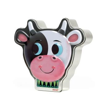 Juego rápido para niños. La vaca muge al encontrar sus manchas. El objetivo es ser el primero en formar una manada de 5 vacas. Debes reconstruir la vaca que aparece en la tarjeta lo más rápido posible en tu cuadernillo. El jugador que termine primero activa la caja muge presionándola. Hay dos niveles de juego: con manchas de colores o solo con manchas negras. Contiene: 36 tarjetas, 4 cuadernillos, 1 caja muge, 1 manual de instrucciones. Materiales utilizados: metal.