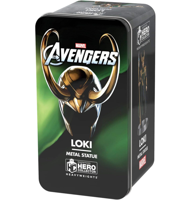 Incluye una caja de metal con una figura de metal del personaje Loki en su interior.